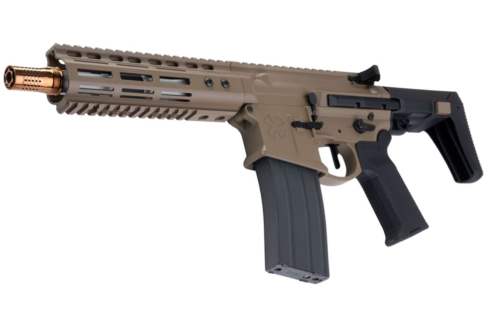 Constructed with a CNC aluminum housing, the Ghetto Blaster mirrors the design of its real-steel counterpart. Aesthetically it features markings replicated on the Super Badass Ambi Charging Handle, Ghetto Blaster iconography on the Dust Cover, and the Noveske logo on the Bolt and Receiver Pins, along with deep engravings of Noveske Ghetto Blaster licensing trademarks on its receiver and handguard. For external components, the Ghetto Blaster includes an enlarged magwell for easier reinsertion of new mags and ambidextrous fire controls, allowing easy access for both right- and left-handed shooters, boasting an ambidextrous fire selector, bolt release, charging handle, and magazine release.